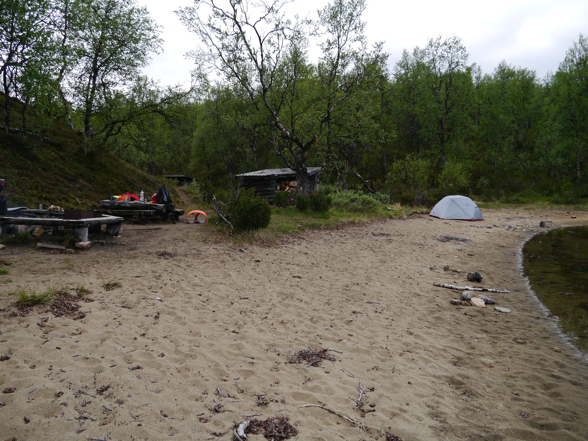 Wir stellen das Zelt auf den kleinen Strand direkt am See.