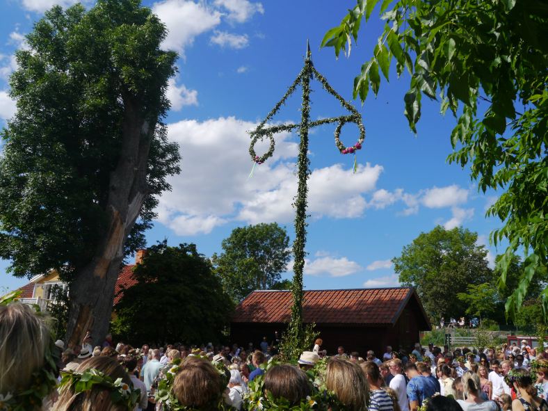 21.06. – Midsommar – Schon am Donnerstag Abend wird es laut im Ort. Nachdem sich das Gewitter verzogen hat, sind alle wieder draußen und fangen schon mal an zu feiern. Amy-Schlitten fahren durch die Gegend mit lauten Motoren und noch lauterer Musik. Am Freitag wollten wir weiterfahren, so war der Plan. Doch Pläne sind dazu da, sie zu ändern…😇 Wir fragen den Hafenmeister, wo hier traditionell Midsommar gefeiert wird. Er freut sich an unserem Interesse und beschreibt uns den Weg. Um drei soll es losgehen. Ein kleiner Garten in der Nähe vom Glockenturm. Wir machen es den Schweden nach und setzen uns auf die Wiese, wo schon der Baum bereit liegt. Dann gibt es eine Begrüßung, danach spricht ( predigt ? ) die Pastorin. Was sie sagt, verstehen wir natürlich nicht, wundern uns jedoch, dass es in der Menge, nach anfänglicher Ruhe, immer lauter wird. Also folgern wir, dass es nicht besonders fesselnd ist, wovon sie spricht. Dann wird es ziemlich laut, die Menge unterstützt mit lauten Rufen die Männer, die den Baum aufstellen. Als er steht und der Mann mit der Gitarre seinen Platz eingenommen hat, entsteht in der Menge eine Dynamik, der ich mich nicht entziehen kann und will. Ich möchte auch tanzen!! 😀 Also lasse ich mich mit der Menge mitziehen.Wir stehen in mehreren Kreisen um den Baum, fassen uns an die Hände und los geht es mit dem Tanz. Ich verstehe nicht, was sie singen, aber vom Nachbarn gucke ich mir die Bewegungen und Gesten mit den Händen einfach ab. Das klappt wunderbar und ich habe richtig Spaß !! Nach einer Stunde ist der Spuk vorbei und jeder geht seiner Wege. Im Hafen an unserem Liegeplatz wird auch kräftig gefeiert, leider schon seit Mittag, d.h. sie haben schon so viel Promille im Blut, dass wir uns lieber auf unser Boot zurückziehen. Am nächsten Tag fahren wir weiter in den Sund auf der Suche nach einer lauschigen, ruhigen Ankerbucht. Wir finden sie, sind aber nicht alleine hier. Zwei schwedische Segler haben mit Landleinen an Felsen festgemacht und ihre laute Musik ist nicht zu überhören. Sie feiern immer noch! Das gute, warme Wetter lädt aber auch dazu ein. Ich vertiefe mich in mein Buch und beschließe, heute nicht zu kochen…😎