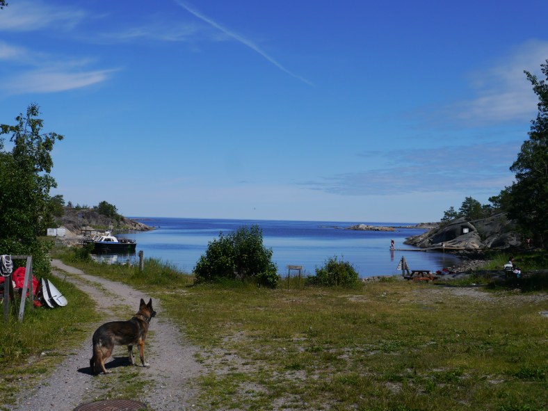 05.07. Finnhamn Paradies Bucht – Nach zwei Nächten in Kapellskär fahren wir weiter nach Finnhamn. Unser Buch beschreibt hier eine Bucht, die tatsächlich auch so heißt: Paradiset !! Da die Wetterlage im Augenblick alles andere als stabil ist, vertagen wir erstmal unser Vorhaben, auf die Außenschären zu fahren. Zur Paradies Bucht segeln wir mal gemütlich, da in Landabdeckung, dann, auf offenen Stellen, recht zügig. Die Landschaft ist sehr abwechslungsreich und traumhaft schön. Dann donnert es gewaltig und Blitze zucken am Himmel. Wir bergen die Segel und ziehen uns wasserdicht an 😤. Es regnet, aber zum Glück nicht lange. In der rundherum sehr gut geschützten Paradies Bucht ankern wir. Allein die Zufahrt zu dieser Bucht ist schon ein Paradies. Kein Haus, nur Wald und vom Eis blankpolierte Felsen. Heute gibt es Dose. Wir haben davon ein paar an Bord…die müssen auch gegessen werden. Am nächsten Tag erkunden wir die Insel. Wir sind natürlich nicht alleine in der Bucht. Es gibt hier die Möglichkeit an Felsen festzumachen und auch an einem kleinen Gästesteg mit Heckbojen. Gegen Abend studieren wir den Wetterbericht…Och nö 😐 schon wieder Sturmwarnung, diesmal 40 Knoten Wind und Regen für Freitag. Da wir überhaupt keine Lust haben bei Sturm und Regen mit dem Gassibötchen an Land zu tuckern, zumal der Außenbordmotor manchmal keine Lust hat und nicht anspringt, verholen wir uns an den Gästesteg. Dann mache ich einen Kartoffelsalat, dazu gibt es Grillfleisch aus der Pfanne. Morgens um fünf geht es dann los. Unser Boot wird hin und her geweht und ruckt so heftig in die Leinen ein, sodass wir meinen, wir sind irgendwo gegengestoßen. Auf den anderen Schiffen sind auch alle wach. Leinen werden zusätzlich ausgebracht, die Ankerlieger gehen auf Drift und müssen erneut ankern. So geht es den ganzen Tag und es regnet in Strömen. Eine kurze Regenpause um zehn nutzt Hajo schnell für die Gassirunde. Nach dem Frühstück ziehen wir uns mit einem guten Buch wieder in die Koje zurück, da es auch empfindlich abgekühlt hat. Erst gegen Abend lassen Wind und Regen nach und wir können endlich eine längere Runde spazieren gehen 😅. Nach diesem Kojengammeltag habe ich gar keine Lust zu kochen…doch mein Kapitän ist da ganz anderer Meinung! Also mache ich das, was weg muß: Kartoffeln, Paprika und Creme fraiche (läuft heute ab) ergibt einen Kartoffelauflauf. Der Kapitän ist zufrieden und somit Frauchen auch.